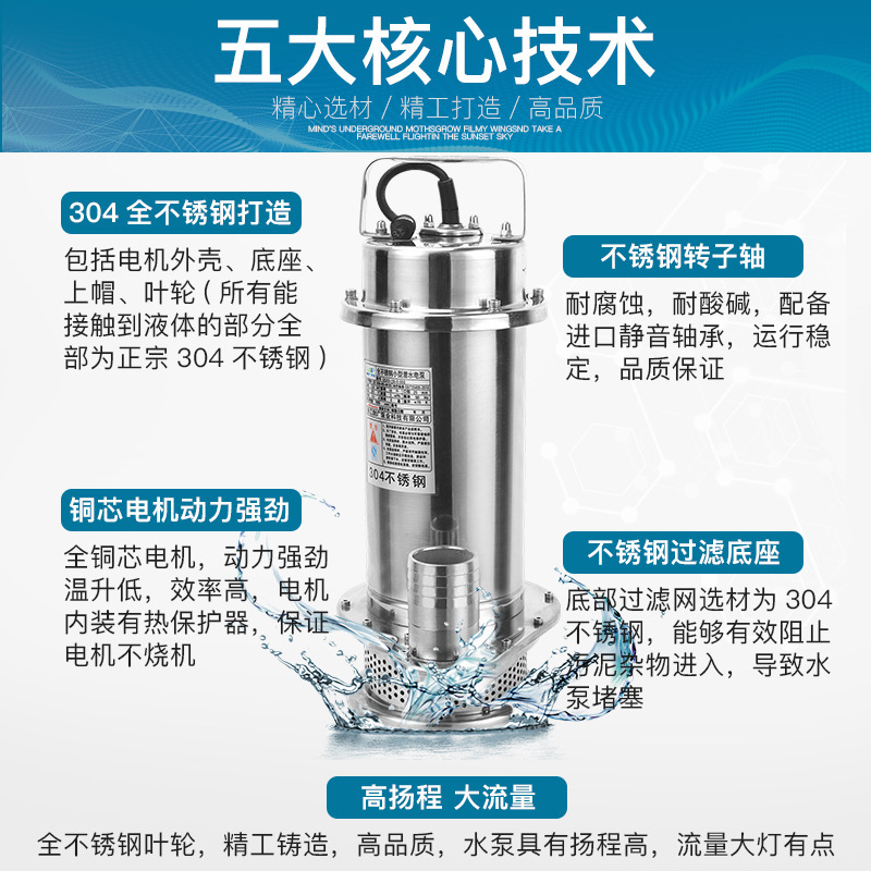 3、泵的整体结构紧凑,体积小、重量轻、检修方便,潜水液下即可使用,电泵内部安装有过热电流保护器,防止电机因过载而过热。